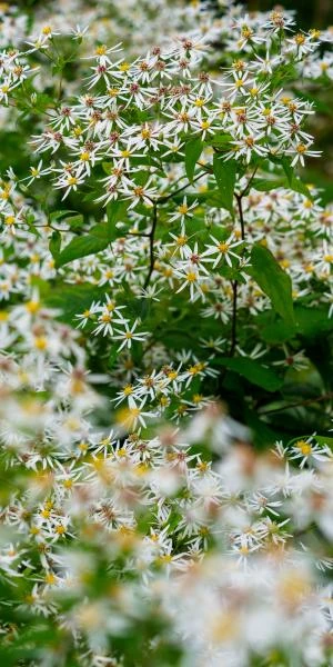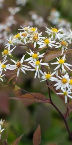 The dark purple wiry stems of this Eurybia hold white daisy flowers in profusion in mid summer. These plants were formally known as Aster divaricatus and this is the newly classified name.