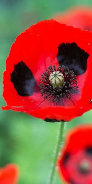 Commonly known as the Ladybird Poppy or the Caucasian Scarlet Poppy, slender stems bear large cup-shaped flowers made up of four crimson-red petals each with a distinctive black blotch. This self-seeding annual forms a clump of featherlike grey-green foliage at its base.